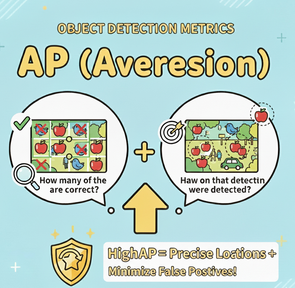 APは、モデルが「見つけた」と主張した検出のうち、正解だった割合の良さを平均した指標です。誤検出(ニセモノ)をどれだけ減らせるかを見るもの、と言い換えられます。